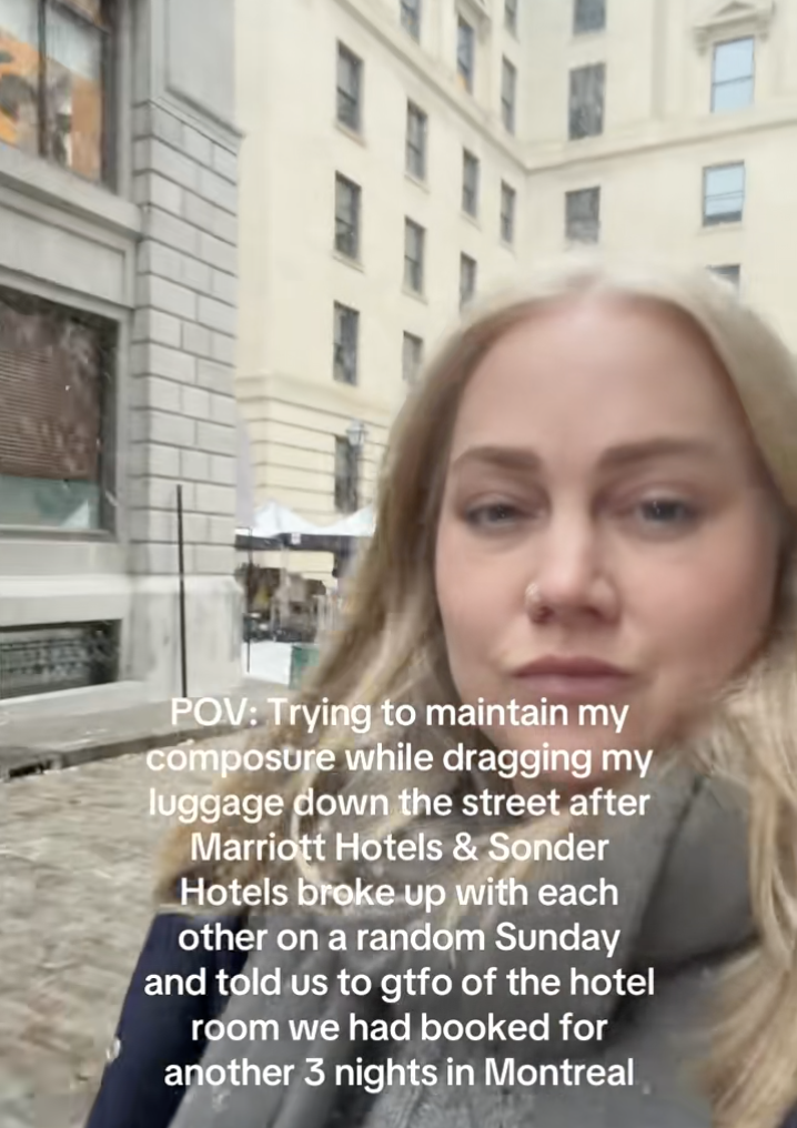 “POV: Trying to maintain my composure while dragging my luggage down the street after Marriott Hotels & Sonder Hotels broke up with each other on a random Sunday and told us to gtfo of the hotel room we had booked for another three nights in Montreal,” Avery wrote in a TikTok post.