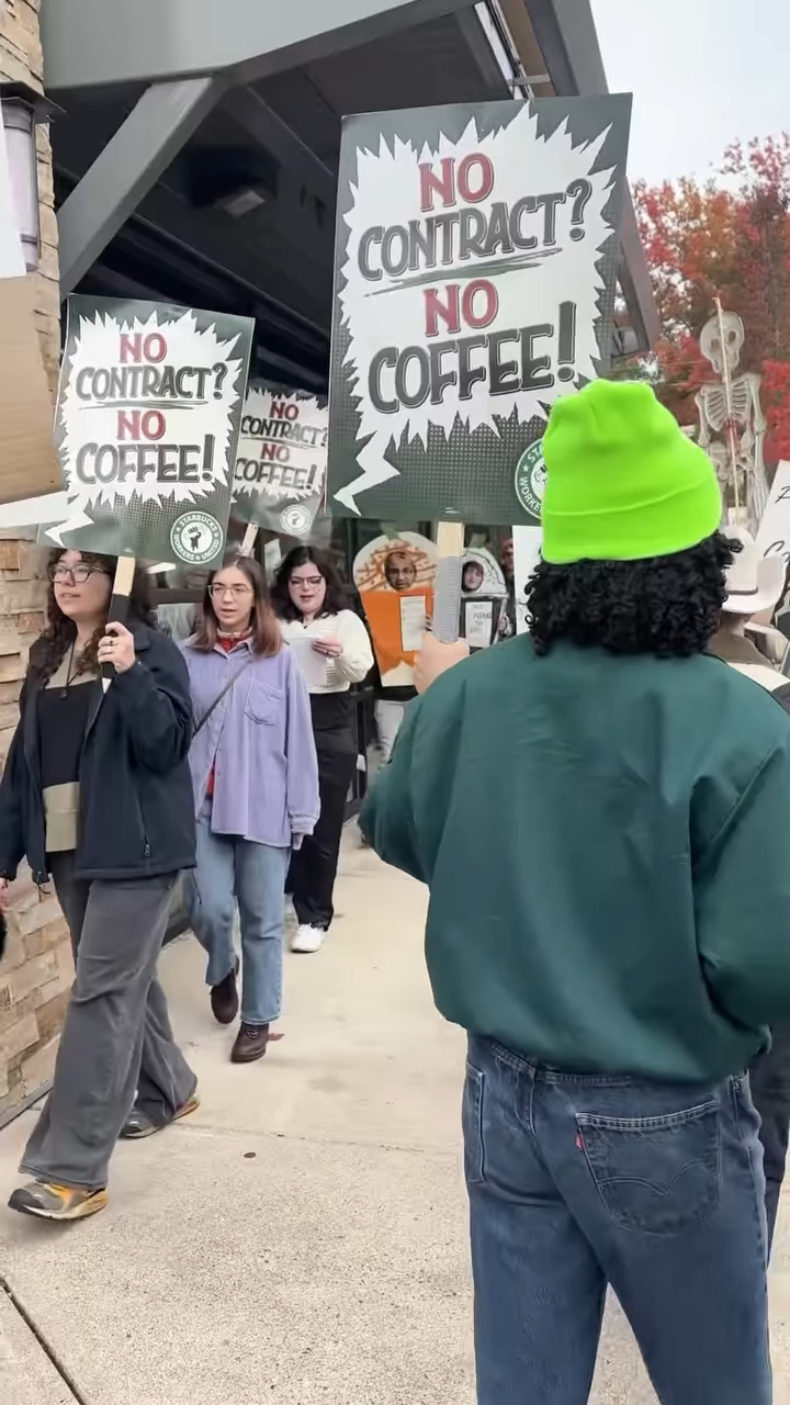 Striking workers say they’re protesting because Starbucks has yet to reach a contract agreement with the union. Starbucks Workers United
