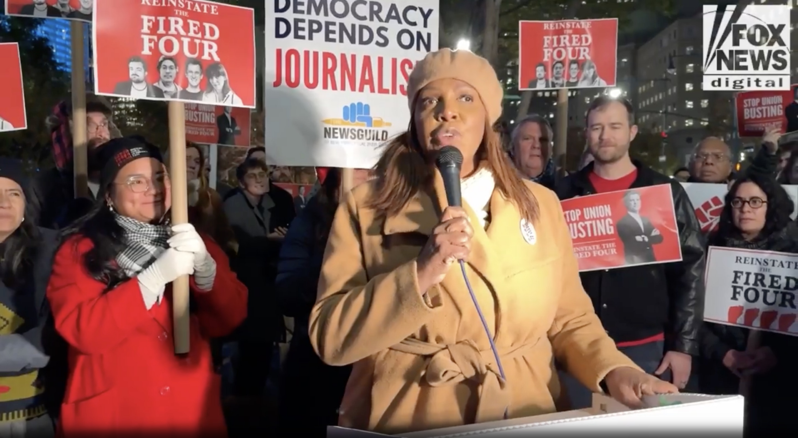 New York Attorney General Letitia James threatened to take Condé Nast to court over the “Fired Four” on Wednesday night during a union rally outside the company’s World Trade Center headquarters.