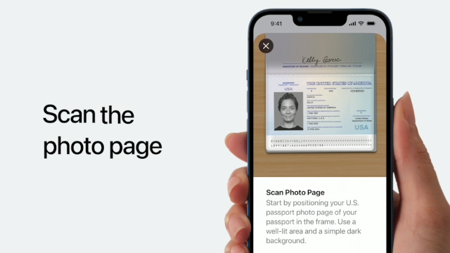Travelers can use the phone camera to scan the passport’s photo page to set it up in their wallet. Apple