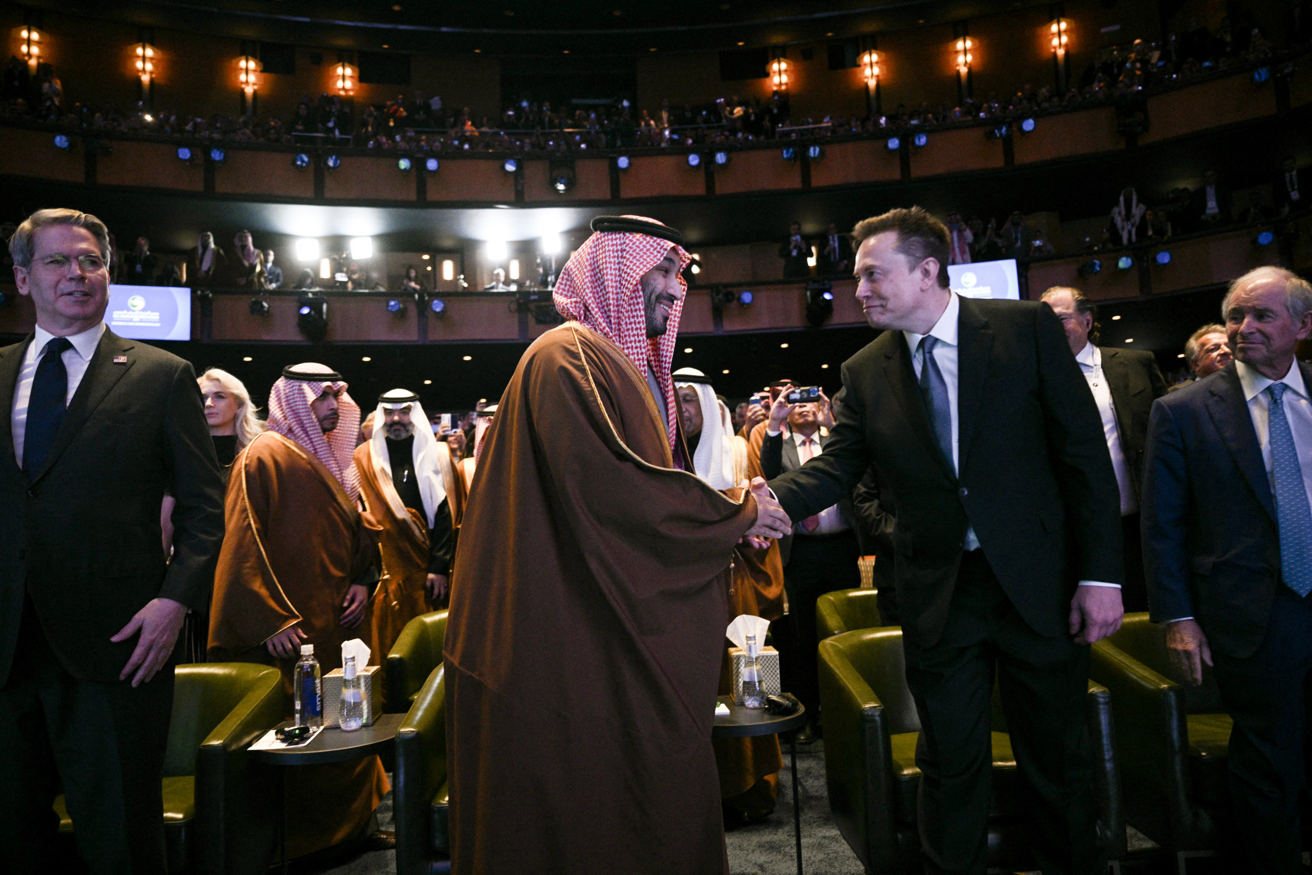 Crown Prince Mohammed bin Salman and Elon Musk shake hands at the US-Saudi Investment Forum. AFP via Getty Images