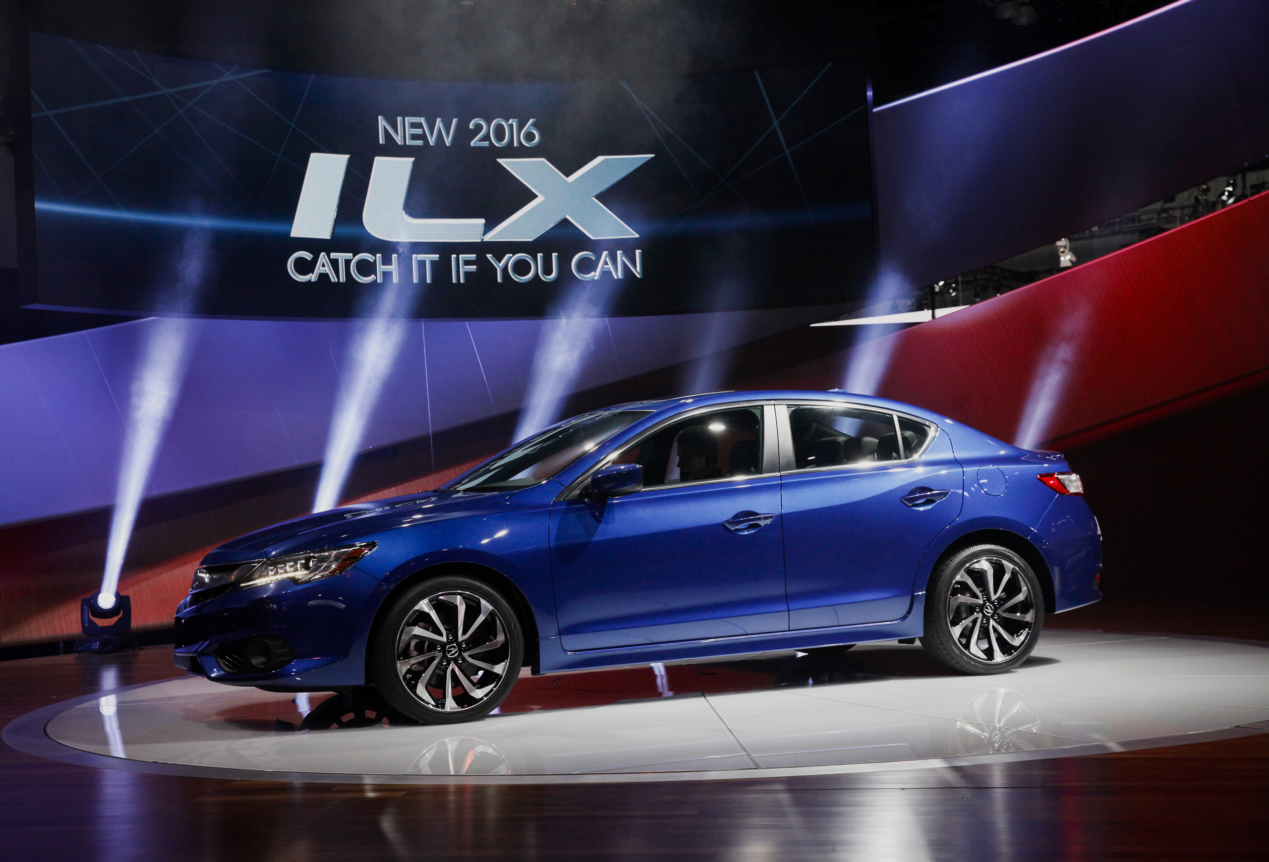 Blue 2016 Acura ILX sedan on display at an auto show.