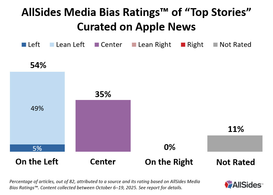 The study’s findings closely matched AllSides’ data about Apple News from a similar analysis conducted in 2023, which found that 53% of articles in the “top news” section came from left-leaning outlets and just 1% from the right.